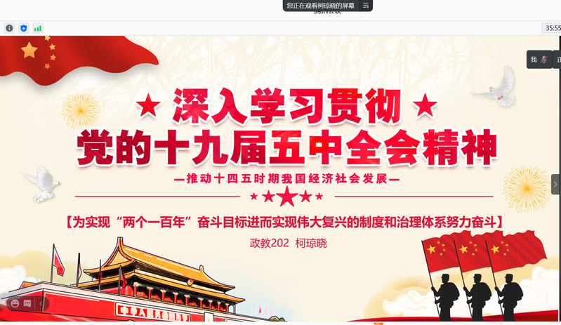 活动伊始,主持人介绍本次活动的分享顺序并宣布活动开始。随后,分享嘉宾以PPT的形式汇报了各自对于“党的十九届五中全会精神”的理解以及心得体会。其中,穆妍竹同学从青年学子的角度分享了对全会精神的感悟,认为青年恰值风华正茂,应学好党的十九届五中全会精神,与国家共发展,与时代共进退。王颖同学则回顾历史并展望未来,从历史坐标中看“十九届五中全会精神”的现实意义。最后,主持人作总结发言,活动圆满结束。