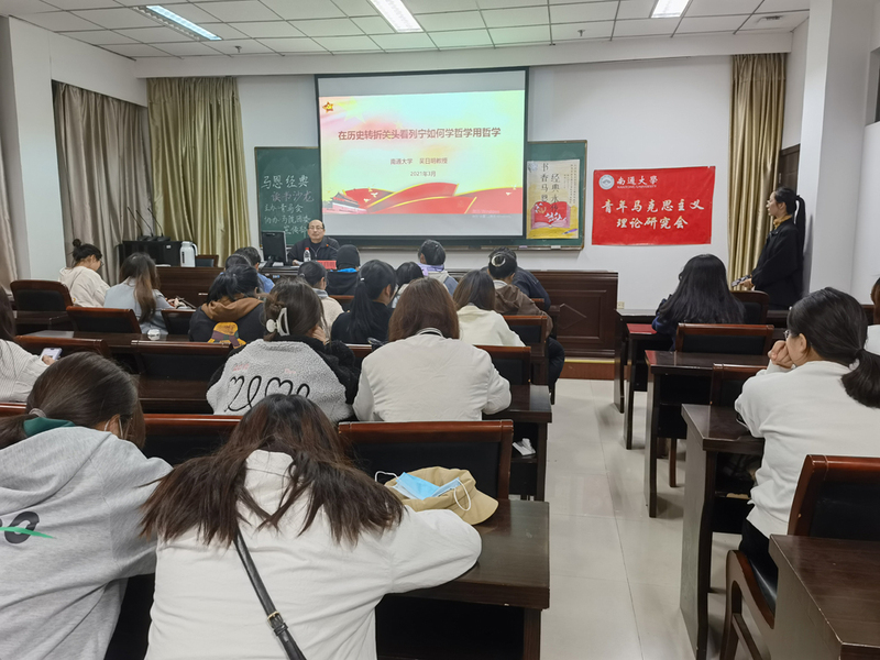 活动伊始,吴教授进行了一系列读书分享,并推荐了《走进列宁的故乡》、《毛泽东三兄弟》等多部记录片供同学们课余观看。随后,吴教授以“在历史转折关头看列宁如何学哲学用哲学”切入正题,特别阐述了列宁对中国共产党发展的影响。最后,吴教授用幽默风趣的语言传授同学们读书的方法,如:“先中后西”、“先普通而后专门”等,并鼓励同学们认真学习,磨炼学习的意志力。