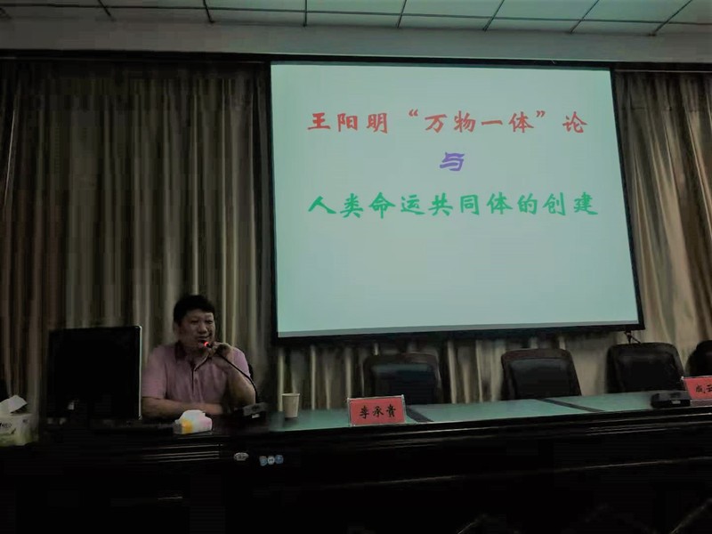 李教授结合自身对王阳明“万物一体”论的感悟,讲解了以下两个方面的内容:一是万物一体论的基础与性质。“万物一体”论的基础是“仁”,它是万物的主宰与见证,其开合与昼夜相应,并贯穿于天地万物之中;“万物一体”所追求的理想社会是有序、守德、公平、向上、活力、富强的社会,即“一体之仁”之社会;二是“万物一体”的意蕴,包含生生不息、克己去私、同苦共痛、爱有差等、心态平和等五个内涵,并对此五个内涵分别加以诠释。最后,李承贵教授总结道:“万物一体”论是以仁为根基,以治世纲维为主轴,以生生不息等五大原理为开展思想的有机思想体制,并将王阳明的“万物一体论”与当代社会治理相结合,升华主题,阐述了自己对于人类命运共同体构建的理解。