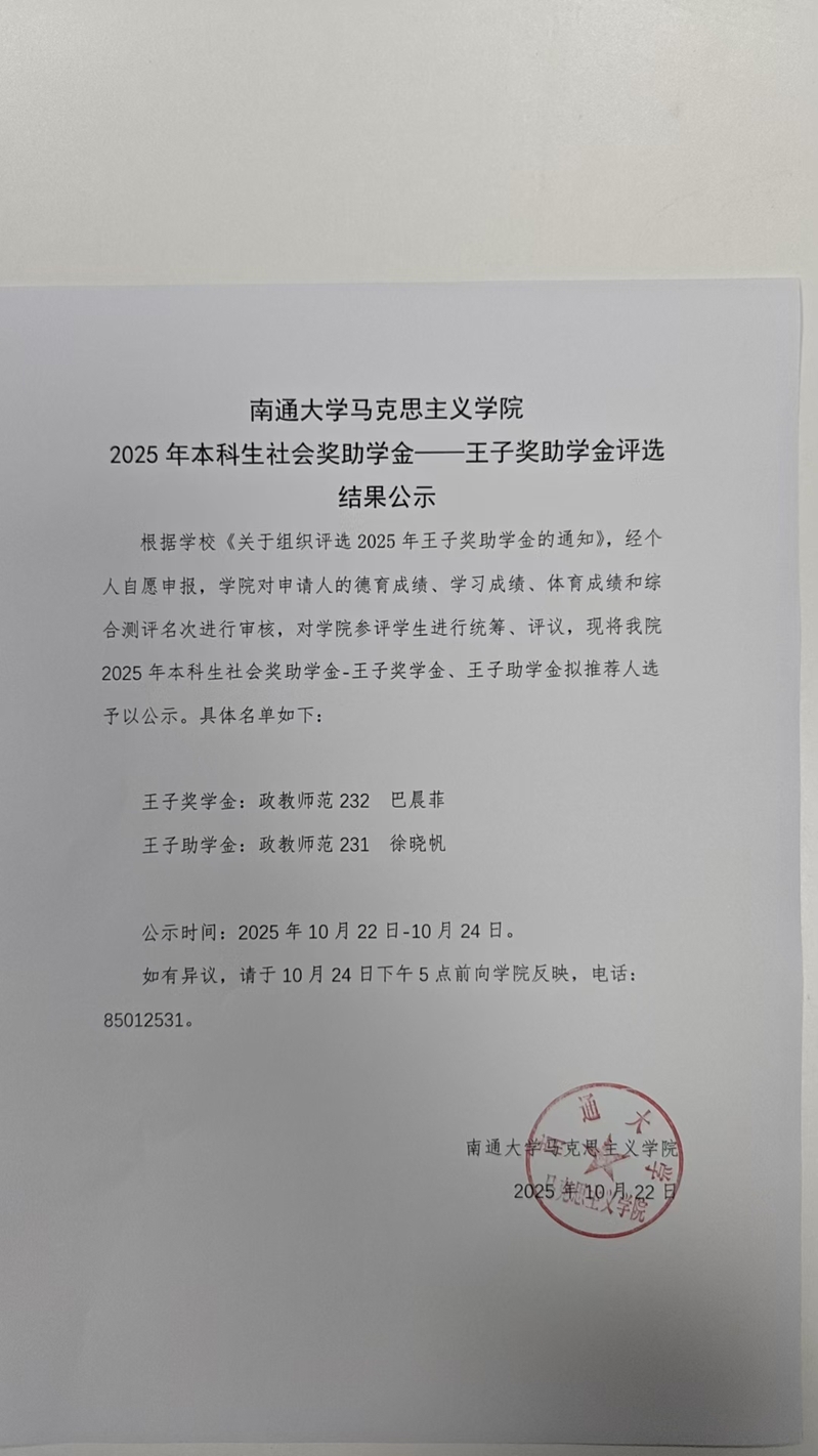 yl23455永利集团2025年本科生社会奖助学金——王子奖助学金评选结果公示