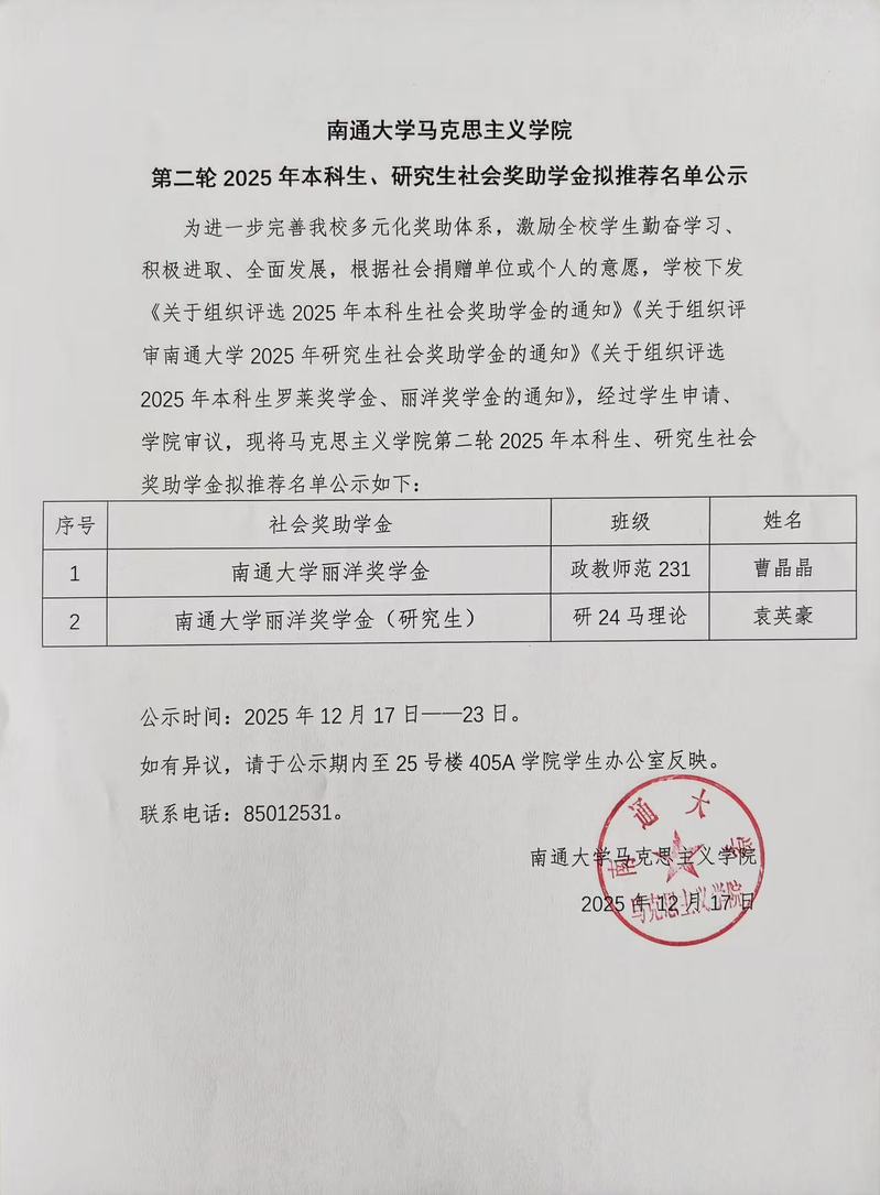yl23455永利集团第二轮2025年本科生、研究生社会奖助学金拟推荐名单公示